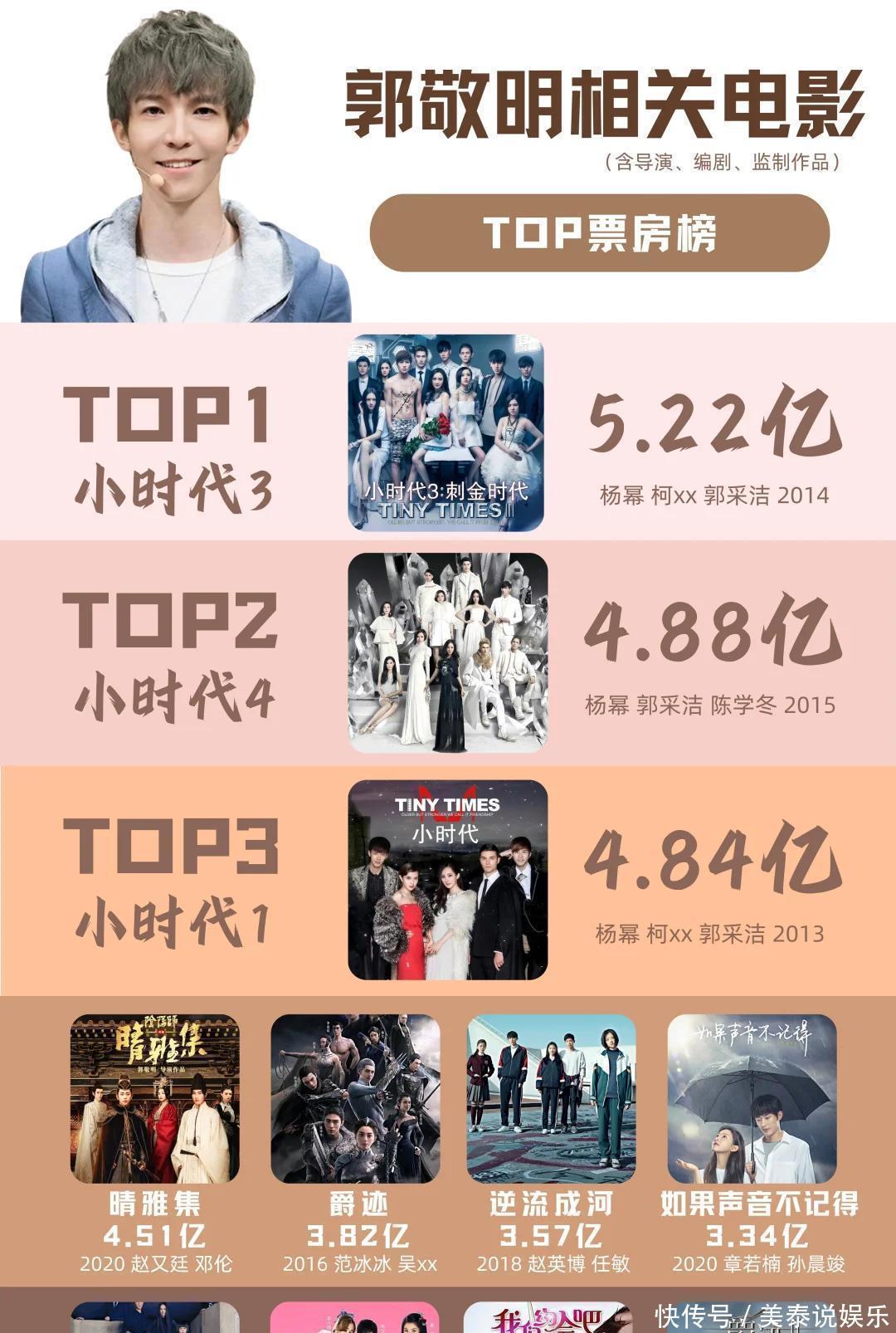 2013年《小时代》一出,现在一想,真是超越很多人的预料。虽然影评界有不少批评,但年轻的观众就是喜欢郭敬明的风格。四部作品累计票房差不多达到了18亿,郭敬明也因此赚得满满的。