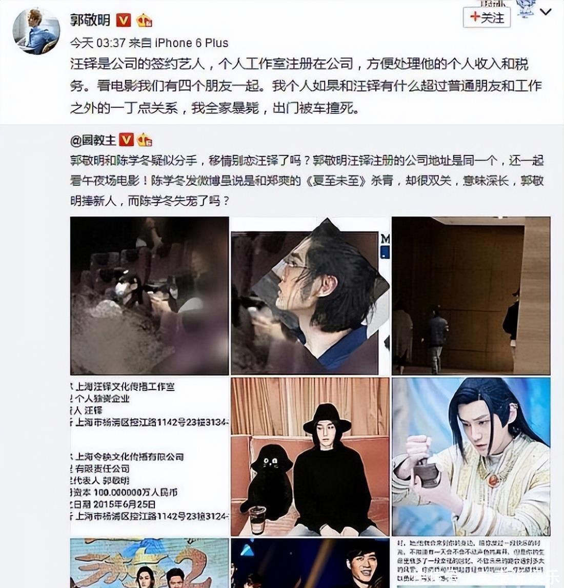 之前有个博主爆料,说郭敬明跟陈学冬好像分手了,还被传跟公司艺人汪铎有些关系,现场还说他们俩一起看了个午夜场的电影。不过,郭敬明在微博上可是一口否认得很,强调汪铎只是公司签约的艺人,工作室注册在公司主要为了方便办事,拍电影那次其实是四个人一起的朋友聚会。他还发誓说:“要是真跟汪铎除了工作还有啥关系,我全家都不得好死,被车撞死都不过分。”